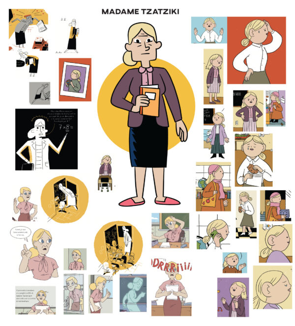 A new book! That I drew! How fun! The fine folks at La Pastèque invited me to play with author André Marois’ “La Classe de Madame Tzatziki” universe, and it was such fun to illustrate the fourth book in the series, Le gâteau empoisonné (“The Poisoned Cake”). Very interesting to work with characters who were initially drawn by other creators, and to try and figure out how to pay homage to the creative work that has come before me and also put my own stamp on the series. Here for instance is a kind of “mood board” I made featuring the teacher Madame Tzatziki’s different appearances in the previous books (including depictions by Patrick Doyon, Célia Marquis, and Audrey Malo) along with my own design for the character.