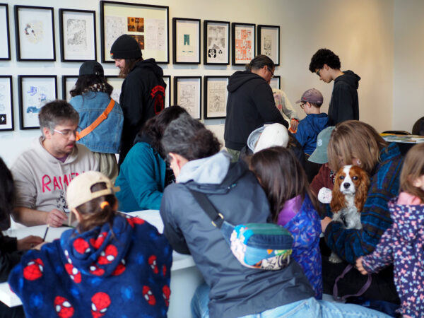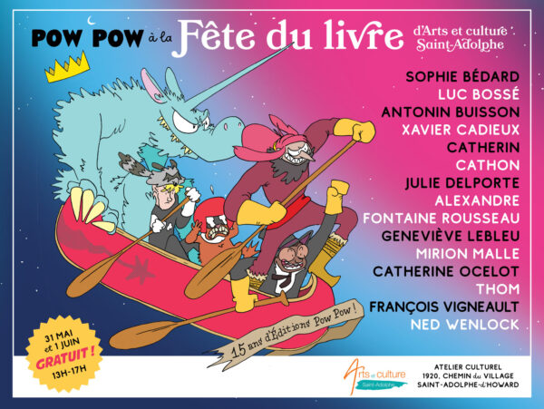 My partner C. and I moved to the small village of Saint-Adolphe-d’Howard in the Laurentian Mountains northwest of Montreal over three years ago, and I am so excited to be getting more involved with the local community. This year Arts & Culture Saint-Adolphe, a non-profit group that puts on art shows and workshops, approached me about participating in their first-ever “Fête du Livre Saint-Adolphe,” and I took it upon myself to help organize a comics-themed weekend. We ended up hosting over 15 creators including international (!!!) creators Ned Wenlock from New Zealand and Mirion Malle from France, as well as publishers Éditions Pow Pow and Revue PLANCHES. The event included an art show celebrating Pow Pow’s 15th anniversary and hands-on workshops for all ages. It was such a delight to host my friends and colleagues in my new home and to connect with readers from all over the Laurentides.