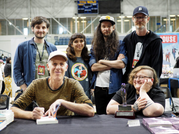 The Pow Pow Crew at TCAF: Standing L-R: Thom, Joana Mosi, Alexandre Fontaine Rousseau, Luc Bossé Seated: Ned Wenlock, Boum (with her Doug Wright trophy)